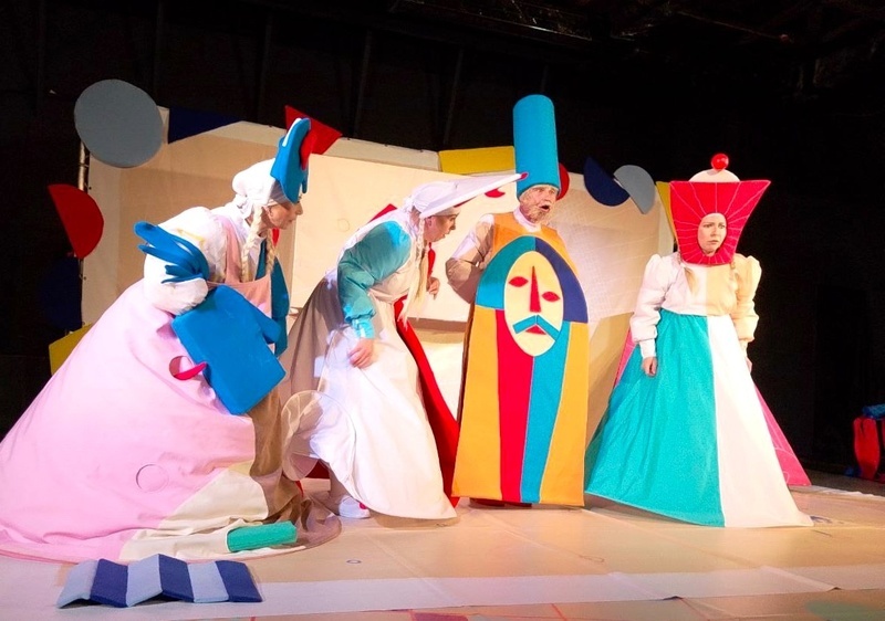 Кто же наши герои? Вероятно, это человечки, которых рисуют маленькие дети – «мазюки». Или ожившие раскраски. В одном эпизоде герой выносит мольберт с по-детски раскрашенной фигурой: яркие штрихи выходят далеко за контуры самого рисунка. В ожидании спектакля детишки в фойе раскрашивали такие и именно так «калякая», а на «стационаре», говорят, в фойе для детей и мольберты ставят до спектакля. До появления мольберта с раскраской на сцене участники выглядят лаконично, в их одеждах основной цвет белый, а силуэты простые, чёткие – как контуры раскраски. Теперь же артисты начинают «раскрашивать» друг дружку как тот рисунок; у них появляются длиннющие рукава, украшения в виде шаров, чёрточек, полукружий, они экспериментируют с ними, балуются. В процессе представления краски постепенно заполняют пространство, к концу шоу нет практически ничего, что не было бы творчески преобразовано командой (сценография, костюмы Павлы Петрушовой и Алмаза Садриева, технолог – Михаил Марченко). Притом костюмы – изначально почти белые платья с длинными юбками на обручах без сборок и складок – минимализмом напоминают как детские рисунки, так и персонажей картин Казимира Малевича; есть у него, например, «Спортсмены», «Крестьяне» и т.п. А задник украшают визуальные «кляксы», которые тоже вызывают ассоциации с супрематическими экспериментами лидера отечественного авангарда. Ближе к финалу на сцене появляются интерактивные объекты, которые уже не оставляют сомнений, что лаконичный стильный визуал спектакля ничего не копирует один в один, но корни имеет именно там, в русском авангарде начала ХХ века; или всё же в детском творчестве? Театры кукол часто выезжают в детские сады, а если бы такой спектакль как «Мазюки» начал бы на постоянной основе сотрудничать с музеями, может быть, искусство сделало бы жизнь подрастающих поколений богаче?